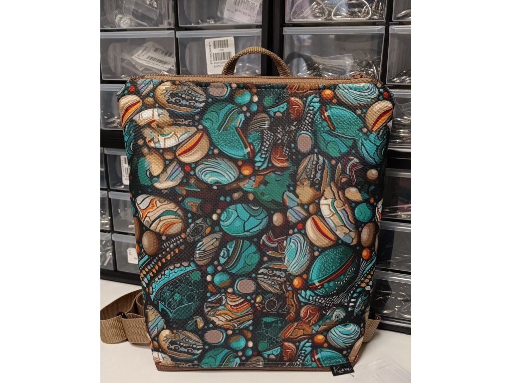 Batůžek je ušitý z kvalitní nepromokavé kočárkoviny, vnitřní podšívka bavlněné plátno. Zádová část je vystužena silnější, měkkou výztuhou (Style-Vil) pro komfortní nošení. Ramenní popruhy jsou polyesterové, s nastavitelnou délkou, šířka 3cm. Batůžek je uzavíratelný na zip, uvnitř v podšívce je jedna kapsa na zip a dvě otevřené kapsičky.