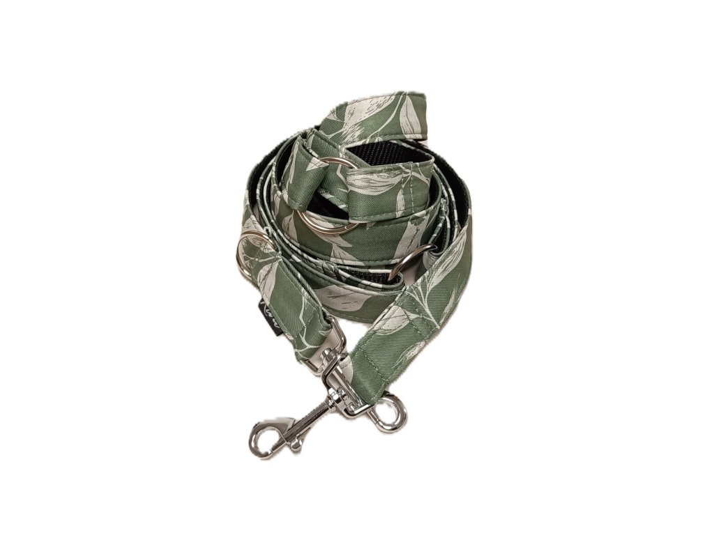 Designové přepínací softshellové vodítko podšité polypropylenovým popruhem pro dodání potřebné pevnosti. Použité kovové karabiny jsou lehké, avšak velmi pevné a odolné, testované na zátěž až 200 či 260 kg (dle zvolené velikosti 76 či 80 mm). Vodítko je vyrobené ze tří částí spojených kovovými kroužky, na každém svém konci má jednu karabinu - lze tedy použít i pro vedení dvou psů.